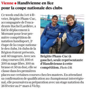 Le Dauphiné Libéré vient de publier un article sur la participation de Brigitte Pham-Cuc à la compétition de natation qui s’est déroulée le 04 février.
