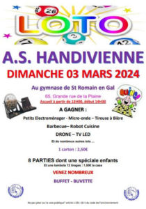 Il se tiendra le dimanche 3 Mars 2024 au gymnase de St Romain en Gal, 65 Grande Rue de la Plaine (affiche en P.J.).