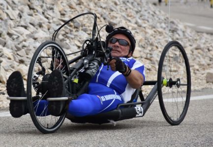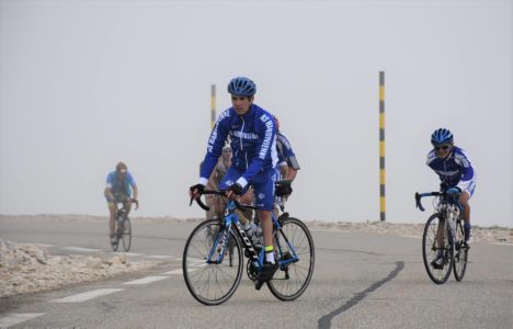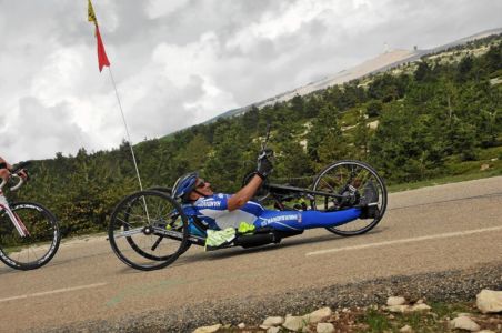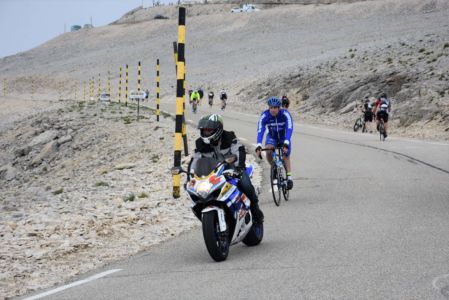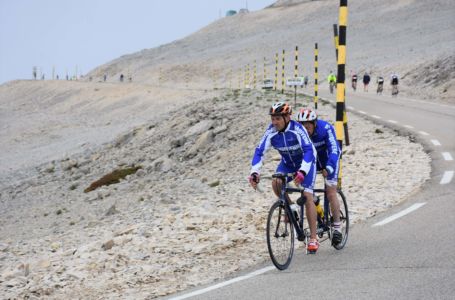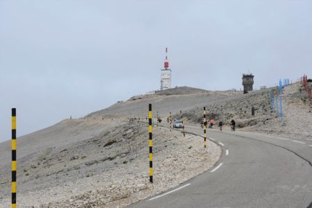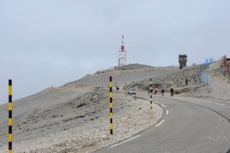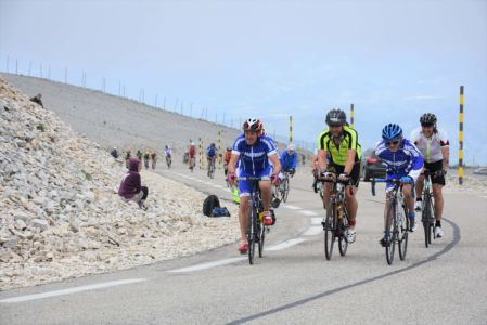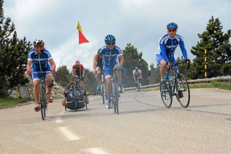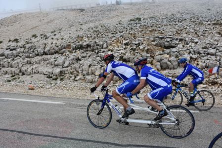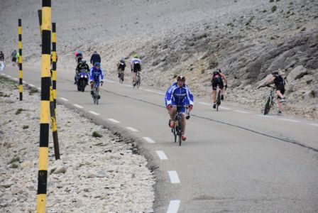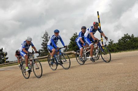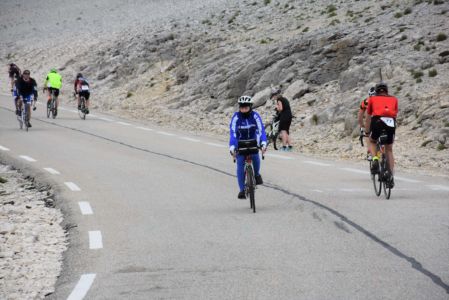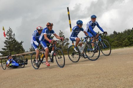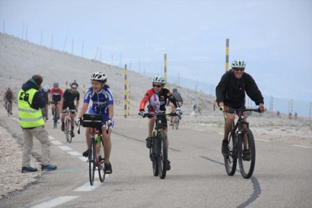 Sommet à 500 M, on n’a pas le droit de mètre pied à terre, on s’arrache, même pas une pensée pour le souvenir Tom Simpson (Tour de France 13 juillet 1967), dernier virage à droite et nous y sommes, 1920 mètres d’altitude. Le Géant Provençale nous félicite de l’avoir conquis et nous savourons enfin cette motivation et le degré de folie qui nous a poussés jusqu’ici (mansion spéciale pour Martine, seule féminine de l’équipe, pour Rolland sur son Handbike et pour nos souriantes assistantes. Le vent s’est levé, nous sommes frigorifiés, vite la photo souvenir (souriez s’il vous plait) puis on se remet en selle et nous plongeons sur le Chalet Reynard. La descente est rapide, il fait froid, on a monté tout çà ?