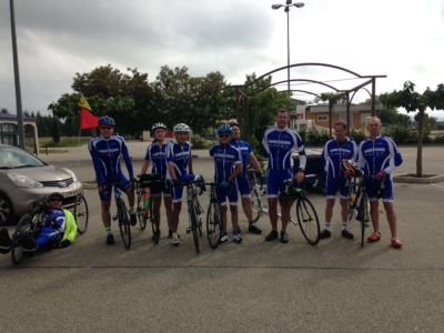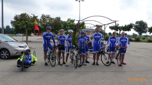 Au départ et en Handbike Louis Rolland, en solo, Martine, Cédric, Gildas, Marc et en tandem, Christian G / Lionel et Christian B / Dominique. Accompagnateurs et supporters, Anne-Marie, Bernadette Jisèle, Nadine et Rolland.