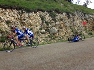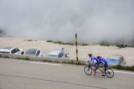 L’équipe regroupée, nous nous élançons alors vers ce sommet qui se découvre peu à peu, comme pour nous saluer, au fur et à mesure de notre progression. Le début est presque agréable avec tous ces cyclistes compétiteurs qui nous entour, qui nous double aussi mais surtout qui nous encourage, parfois plus que de raison. Plus nous progressons, plus la pente s’élève, plus les muscles se raidissent, alors que le souffle se raccourcit. Partis avec 6% de dénivelé, nous passons rapidement à 7, puis 8, pour terminer à11% ! Le dernier Km est particulièrement éprouvant mais dans l’équipe nous avons des champions en Solo qui se font plaisir. Pour les tandems, c’est plus compliqué et avec tout le respect qu’il se doit, on pourraient les comparer aux escargots qui montent aussi haut que tout le monde mais qui en bave d’avantage…