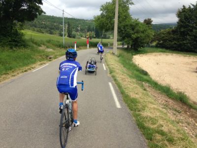 C’est enfin l’heure du bien sympathique repas (plat du jour, dessert et bière pour la réhydratation et nous rejoignons Sault (20 Kms plus bas) avec les Tandems qui s’offrent le lux d’une descente à 67 Km’H de moyenne, juste pour le plaisir !
