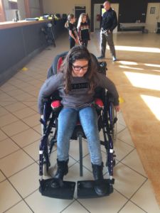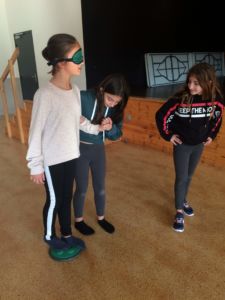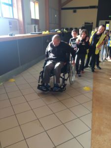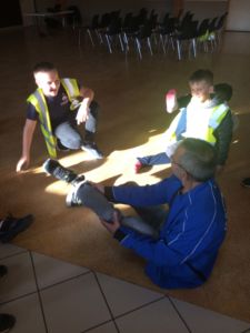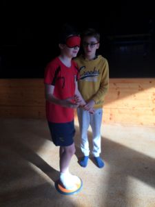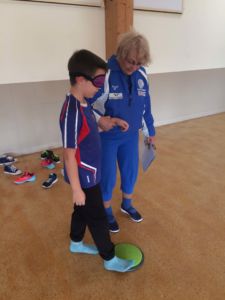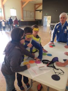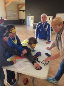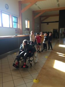Léa forme ensuite des groupes pour les ateliers découvertes où les enfants passent tour à tour du parcours en fauteuil Handisport avec des cerceaux, des quilles etc., puis les yeux bandés, au parcours « non voyant » avec les plots sensitifs à découvrir. Beaucoup d’intérêt et de participation volontaire des enfants.
